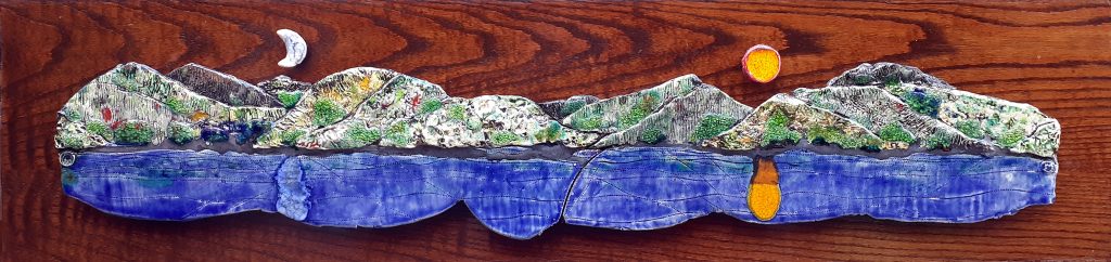 79″W x 29″H – raku-fired ceramic on wood backing – 1989/2020