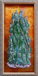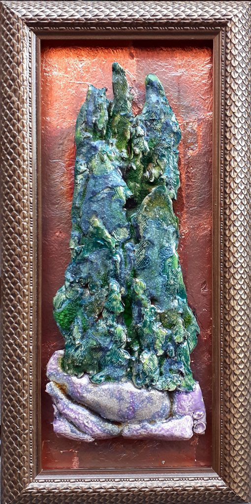 This tree, I depict on this hammered copper mural, moved me. It could be hundreds of years old, as the centuries reoccurring forest fires could not destroy it. It grows at such unforgiving location that it is ‘untouchable’. Also at the same time the poor nutrition supply and the harsh weather conditions let it grow so slow that a small tree, as mentioned above, could be 200-300-500 years old.